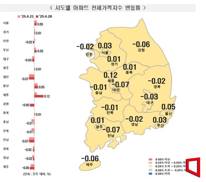 같은 기간 전국 아파트 매매가격 지수는 오히려 0.02% 하락했고, 전세가격 지수는 변화가 없었거든요.