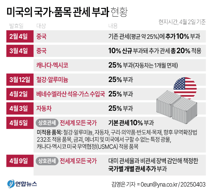 4. 보편 관세는 오는 4월 5일부터, 상호 관세는 4월 9일부터 각각 효력이 발생될 예정입니다.