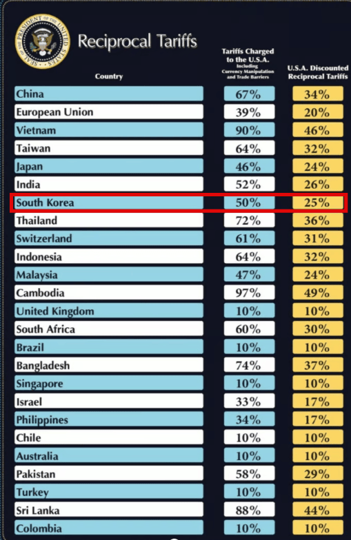 핵심내용은 미국으로 수입되는 모든 제품에 10% 기본관세를 부과하고 대미 흑자국에 추가로 징벌적 관세를 얹는 상호관세 부과한다는 내용입니다. 시장의 예상보다 부과율을 크게 상회했습니다.